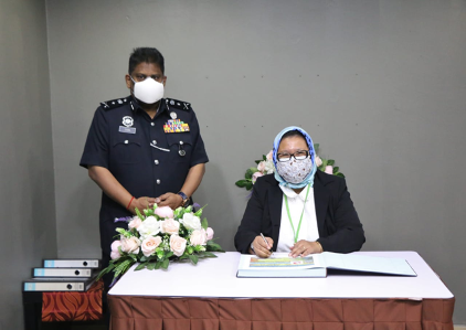YBhg Puan Mas Tina Abdul Hamid, Co-ordinator of VTREC signing the Visitor Book, witnessed by YDH Tuan SAC S Shanmugamoorthy Chinniah, Ketua Penolong Pengarah, Jabatan Siasatan Jenayah D4, Bukit Aman BUKIT AMAN, 21 January 2022: The Co-ordinator of Vehicle Theft Reduction Council of Malaysia (VTREC), Puan Mas Tina binti Abdul Hamid…