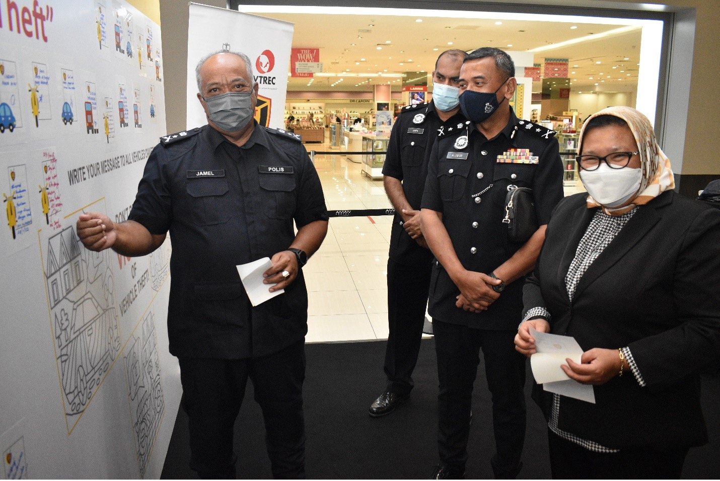 YDH Tuan SAC Jamel Salleh, Ketua Penolong Pengarah Operasi Darat, Jabatan Pencegahan Jenayah dan Keselamatan Komuniti (JPJKK) Bukit Aman contributing his protect vehicle from theft messages at the PDRM-VTREC’s Doodle Wall at Aman Sentral Mall, Alor Setar Kedah, accompanied by Puan Mas Tina Abdul Hamid, Co-ordinator of VTREC and YDH…