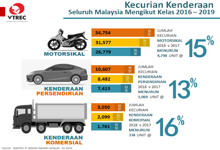 BUKIT AMAN: Statistik jenayah kecurian kenderaan di Malaysia merekod penurunan sepanjang 3 tahun yang lalu dari tahun 2016 sehingga tahun 2019. Bilangan kehilangan motorsikal juga mencatat kesan positif dengan penurunan sebanyak 15% dalam tempoh yang sama tahun lalu. Pengurus Vehicle Theft Reduction Council of Malaysia Berhad (VTREC), Puan Mas Tina…