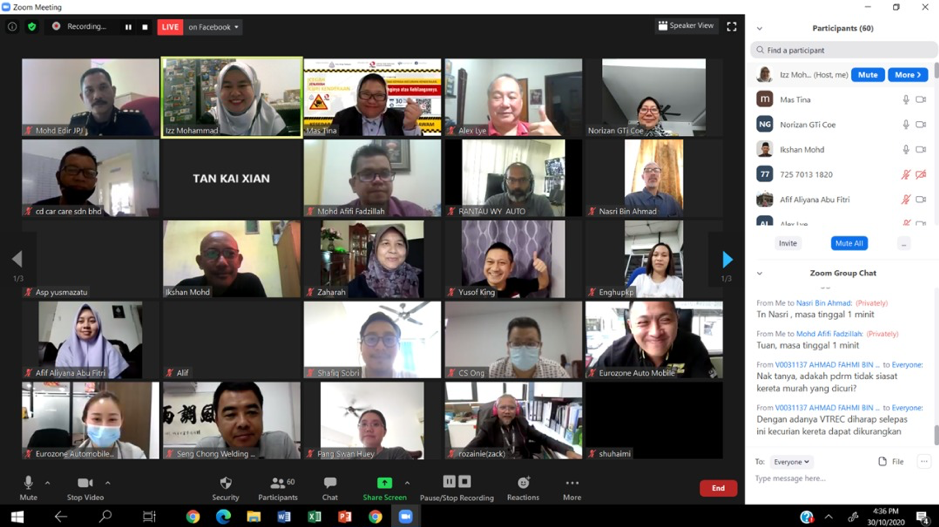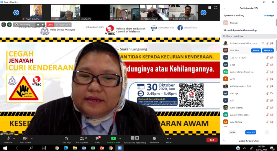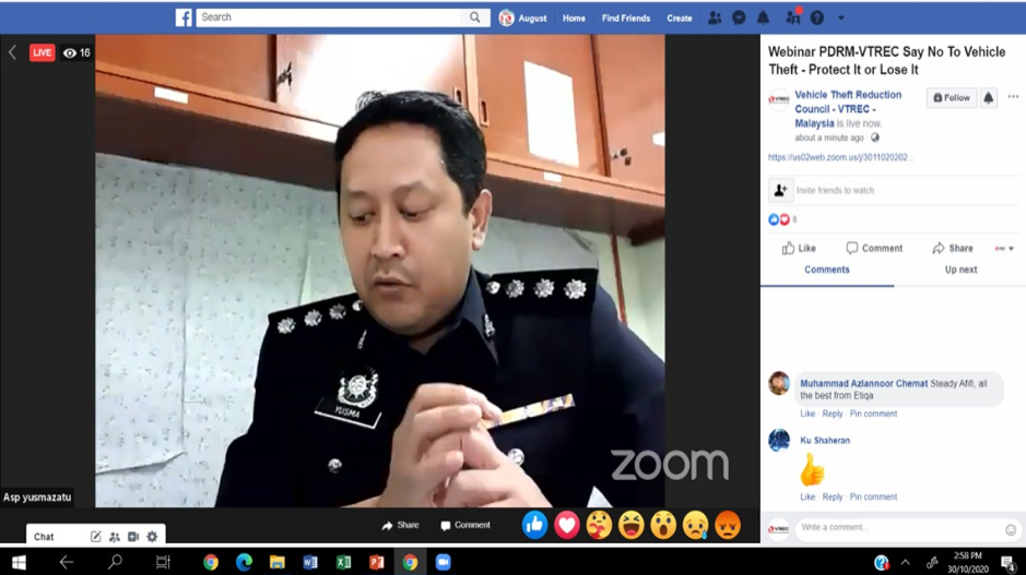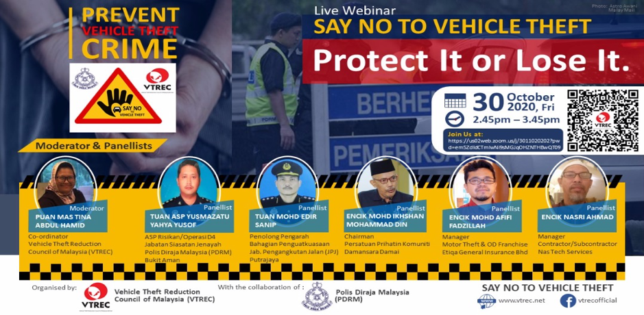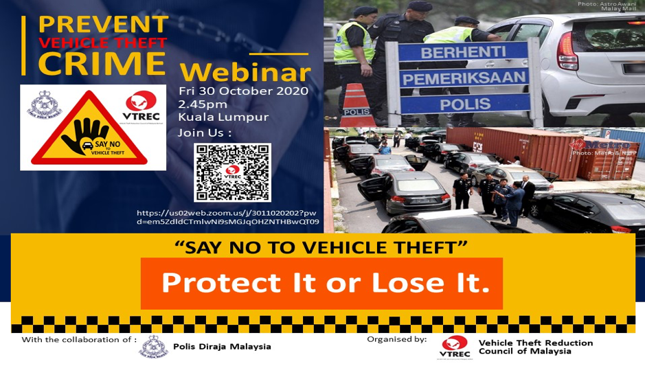 KUALA LUMPUR, 30 October 2020: The Vehicle Theft Reduction Council of Malaysia (VTREC) and Polis Diraja Malaysia (PDRM) engaged in its first ever online initiative programme #SAYNOTOVEHICLETHEFT. A webinar with a tagline “Protect It or Lose It” engaging with the public was successfully conducted with over 100 participants joining.