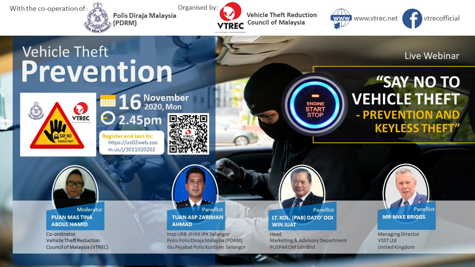 KUALA LUMPUR, 11 November 2020: The Vehicle Theft Reduction Council of Malaysia (VTREC) in collaboration with Polis Diraja Malaysia (PDRM) – Jabatan Pencegahan Jenayah dan Keselamatan Komuniti (JPJKK) Ibu Pejabat Kontigen (IPK) Selangor will be hosting a Best Practice Sharing webinar titled “Say No to Vehicle Theft – Prevention and Keyless Theft”, scheduled for Monday 16 November 2020.