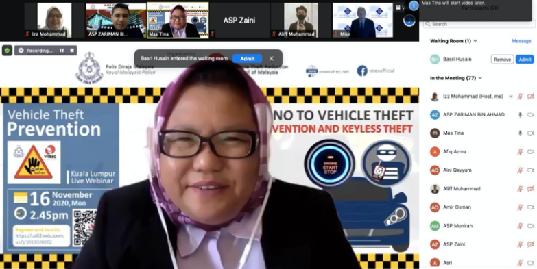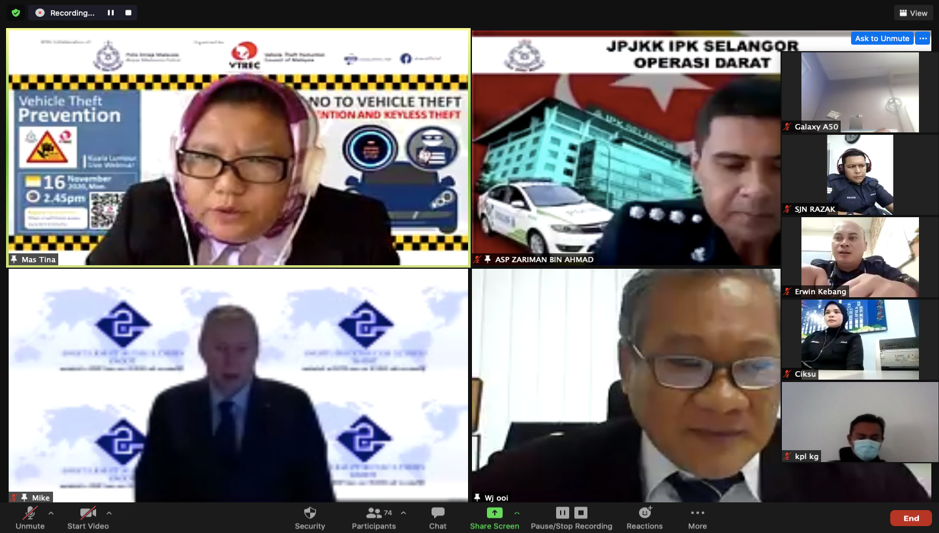 KUALA LUMPUR, 16 November 2020: The Vehicle Theft Reduction Council of Malaysia (VTREC) and Selangor Polis Diraja Malaysia (PDRM) embarked on a collaboration of exclusive webinar for Selangor PDRM Officers on vehicle theft and prevention of vehicle theft crime. The webinar was hosted by VTREC as part of VTREC’s role in engaging the stakeholders in combating the vehicle theft crime in Malaysia, entitled “SAY NO TO VEHICLE THEFT: Prevention and Keyless Theft”.