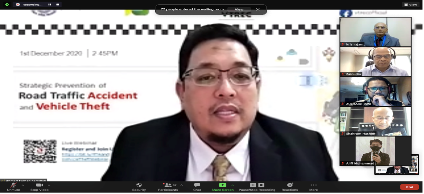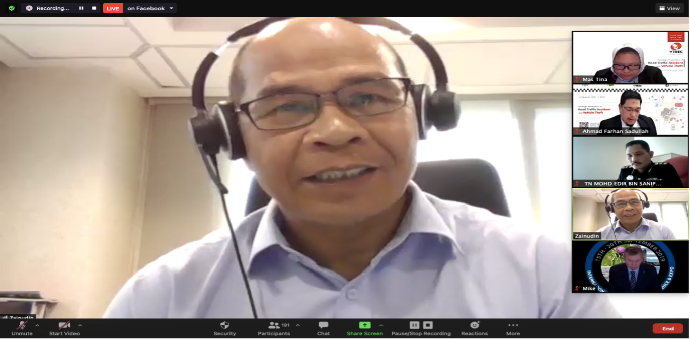 KUALA LUMPUR, 1 December 2020: The Vehicle Theft Reduction Council of Malaysia (VTREC) with Polis Diraja Malaysia (PDRM) and Persatuan Insurans Am Malaysia (PIAM) embarked on a collaboration for the public in a live webinar entitled “Strategic Prevention of Road Traffic Accident and vehicle Theft”. The webinar was hosted by VTREC as part of VTREC’s role in engaging the stakeholders in combating the vehicle theft crime in Malaysia other than creating awareness towards the public on this particular crime and this time bringing something new into the limelight touching on Road Traffic Accidents and what is the coloration between the two.