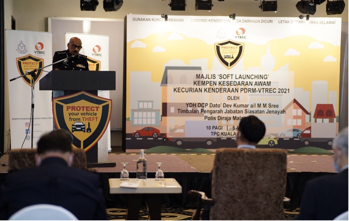 The soft launching with theme @Protect Your Vehicle From Theft” was officiated by Bukit Aman CID (Intelligence/Operations) deputy director Deputy Comm Datuk Dev Kumar. The soft launch were also attended by other government agencies such as Jabatan Pengangkutan Jalan (JPJ), Bahagian Keselamatan Jalanraya (BKJR) as well as non-government agencies among others from Persatuan Insurans Am Malaysia (PIAM), Malaysia Takaful Association (MTA), PUSPAKOM Sdn Bhd (PUSPAKOM) and Association of Loss Adjuster (AMLA). The Soft Launching of PDRM-VTREC Vehicle Theft Public Awareness Campaign 2021 took place at TPC Kuala Lumpur, today.