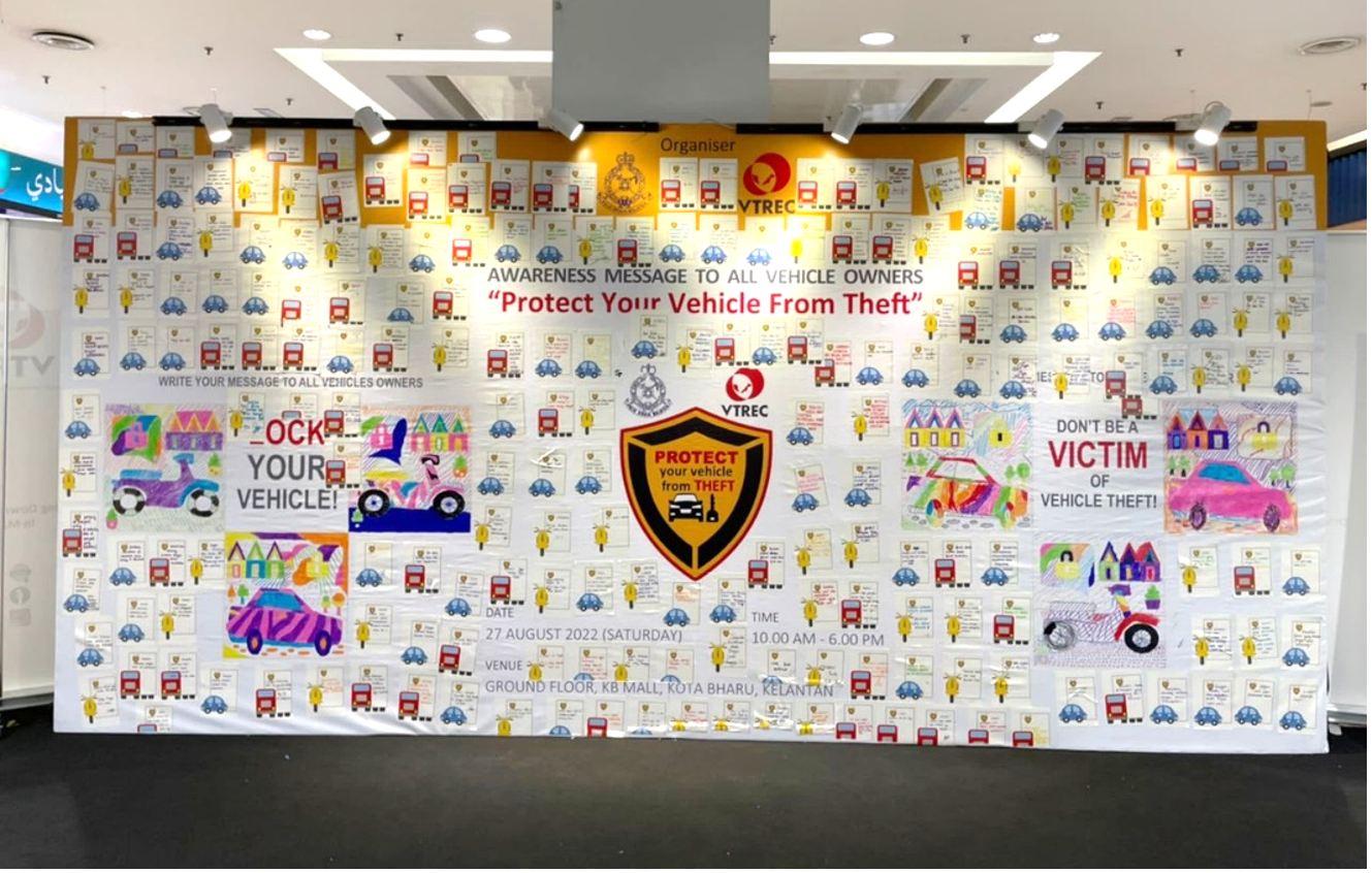 The campaign was held in The KB Mall, Kota Bharu and was attended by more than 1,500 public from Kota Bharu and surrounding areas participating the advocacy including talk on responsibility of public to protect their vehicles. The effort is expected to be able to nurture the mentality and behaviour change to reducing crime of vehicle theft especially within their community areas. The participants also contributed to activities such as writing messages on Doodle Wall, colouring the Doodle Wall, contests and quizzes.