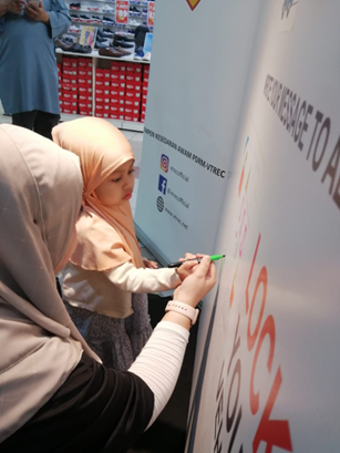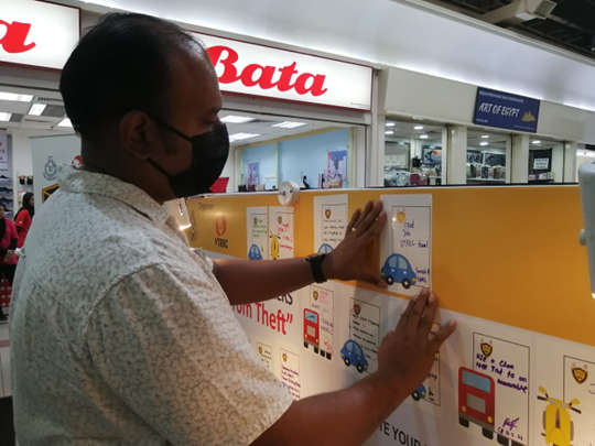 YBrs Puan Mas Tina Abdul Hamid, Co-ordinator of VTREC and Puan Sub-Inspector Peramah Selvi A/P Karuppiah of Bahagian Pencegahan Jenayah dan Keselamatan Komuniti (BPJKK), Polis Diraja Malaysia, Daerah Kelang Selatan pasting their message on the awareness engagement wall.
