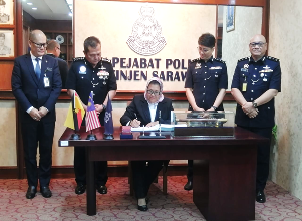 YBrs Puan Mas Tina Abdul Hamid, Co-ordinator of Vehicle Theft Reduction Council of Malaysia signs the Visitor’s Book at IPK Sarawak witnessed by The Deputy Police Commissioner of Sarawak, YDH DCP Mancha Anak Ata and other PDRM Officers.