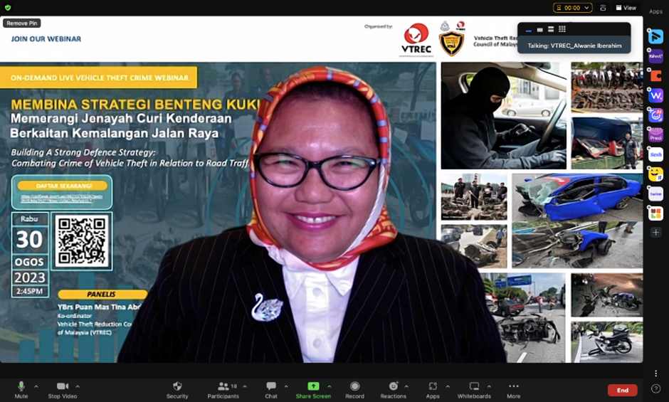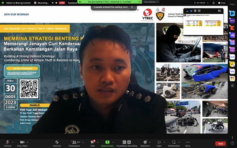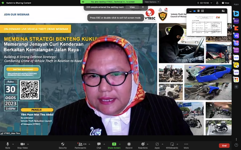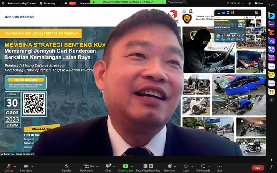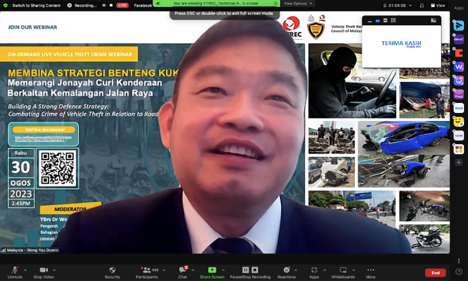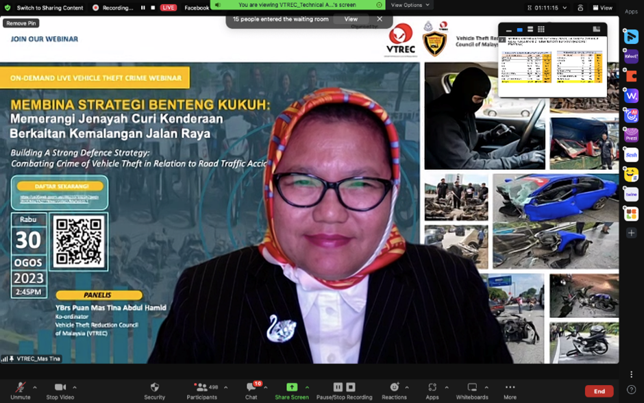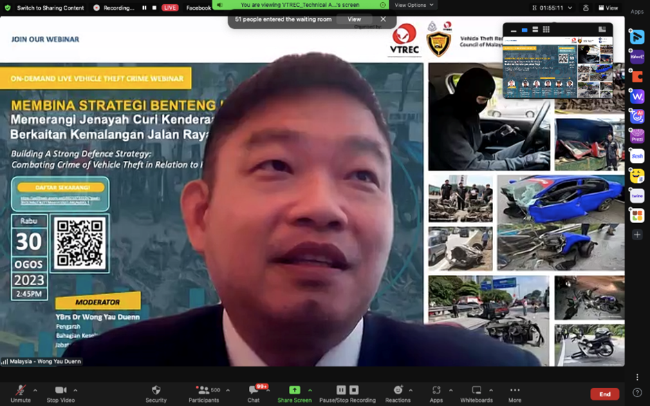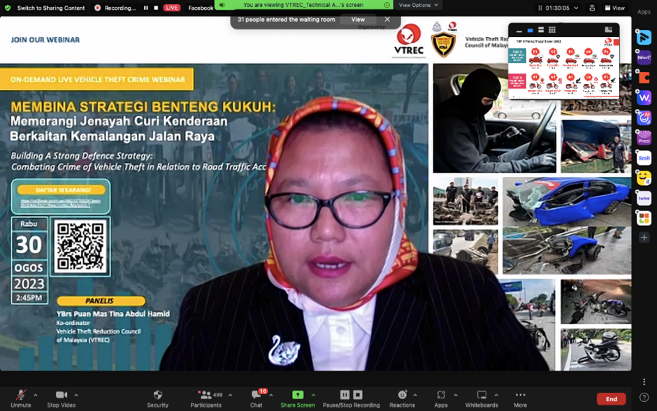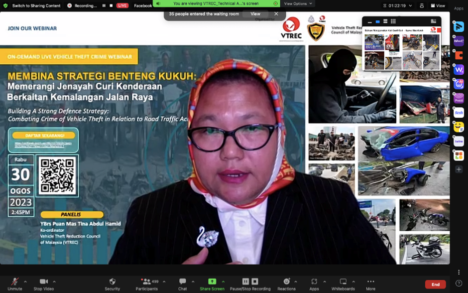 Kuala Lumpur, 30 August 2023: The Vehicle Theft Reduction Council of Malaysia (VTREC) with the co-operation of Polis Diraja Malaysia (PDRM), Jabatan Pengangkutan Jalan Malaysia (JPJ) and Malaysian Institute of Road Safety Research (MIROS) organised the Building a Strong Defence Strategy: Combating Crime of Vehicle Theft in Relation to Road Traffic Accident webinar. The webinar had more than 800 participants from various government agencies especially the enforcement agencies, non-government agencies, insurance industry, automotive industry, financial industry, students and public. The aim was to raise awareness on vehicle theft in relation to road traffic accidents, to fill up the knowledge gap and empower the public to make safer choice.