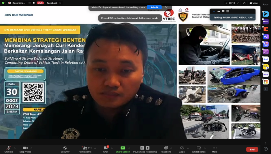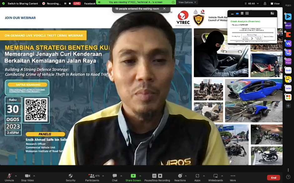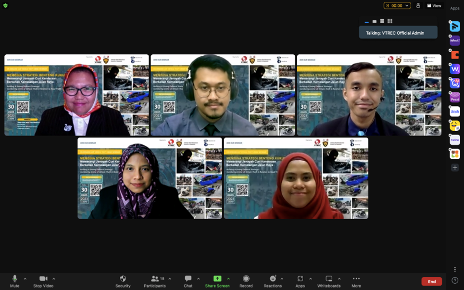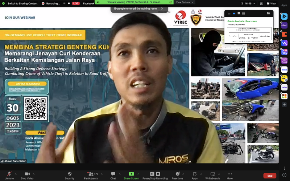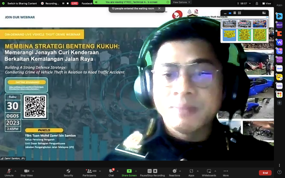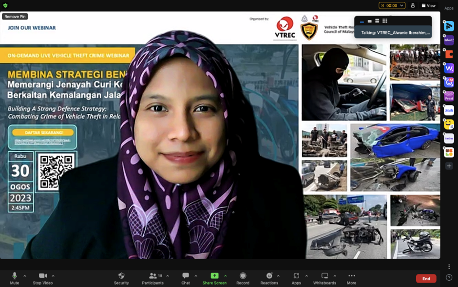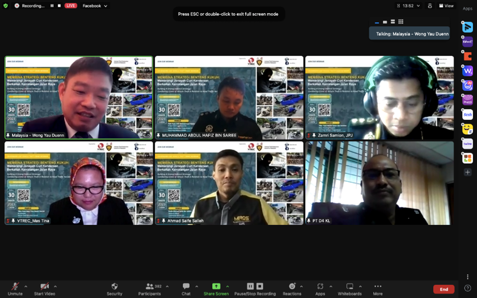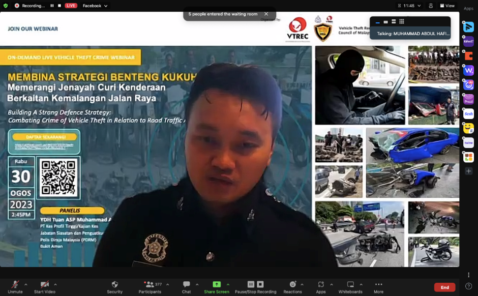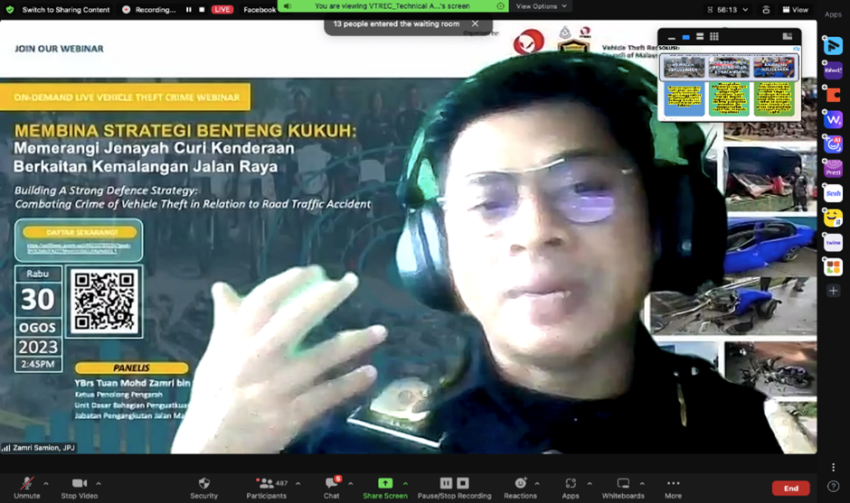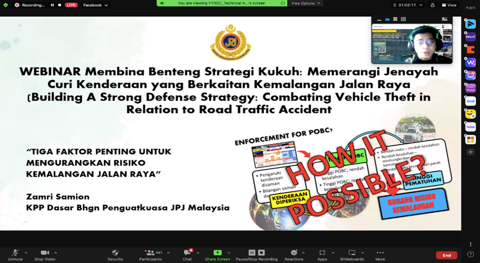Kuala Lumpur, 30 August 2023: The Vehicle Theft Reduction Council of Malaysia (VTREC) with the co-operation of Polis Diraja Malaysia (PDRM), Jabatan Pengangkutan Jalan Malaysia (JPJ) and Malaysian Institute of Road Safety Research (MIROS) organised the Building a Strong Defence Strategy: Combating Crime of Vehicle Theft in Relation to Road Traffic Accident webinar. The webinar had more than 800 participants from various government agencies especially the enforcement agencies, non-government agencies, insurance industry, automotive industry, financial industry, students and public. The aim was to raise awareness on vehicle theft in relation to road traffic accidents, to fill up the knowledge gap and empower the public to make safer choice.