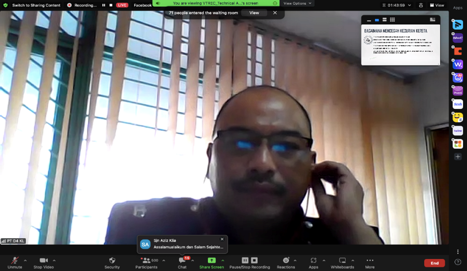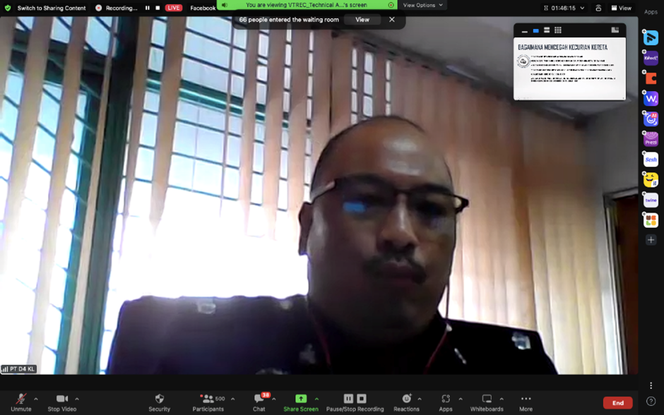 The moderator of the webinar, YBrs Dr Wong Yau Duenn, Pengarah, Bahagian Keselamatan Jalan Raya, Jabatan Pengangkutan Jalan Malaysia (JPJ) begins by welcoming all of the Panellists with a brief introduction and then continue to the objective of the webinar. The webinar gathered a list of specialists on topic of vehicle theft and road traffic accidents ranging from Jabatan Siasatan Jenayah PDRM, Jabatan Siasatan dan Penguatkuasaan Trafik (JSPT) PDRM, VTREC and MIROS. The Panellists presented statistics, data, information, ideas, techniques, and next steps in addressing the recent strategies to combat vehicle theft crime and to improve road safety and life savings.