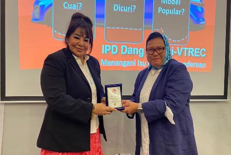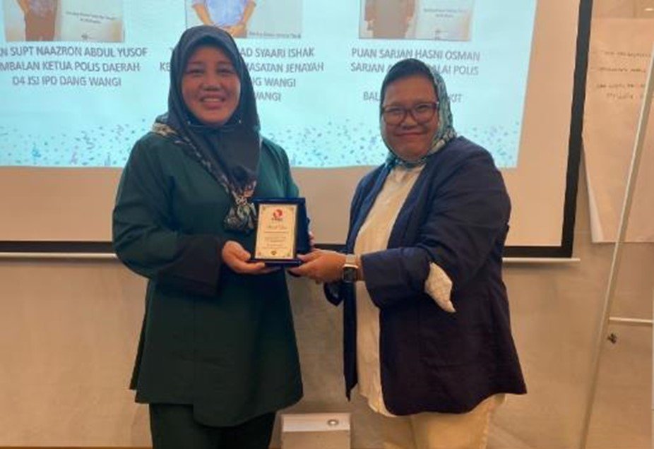 YBrs Puan Mas Tina Abdul Hamid, Co-ordinator of Vehicle Theft Reduction Council of Malaysia (VTREC) presenting a memento to YDH Puan DSP Saheela Abu Bakar, Ketua Bahagian Pencegahan Jenayah dan Keselamatan Komuniti IPD Dang Wangi, Polis Diraja Malaysia at the Lab IPD Dang Wangi – VTREC