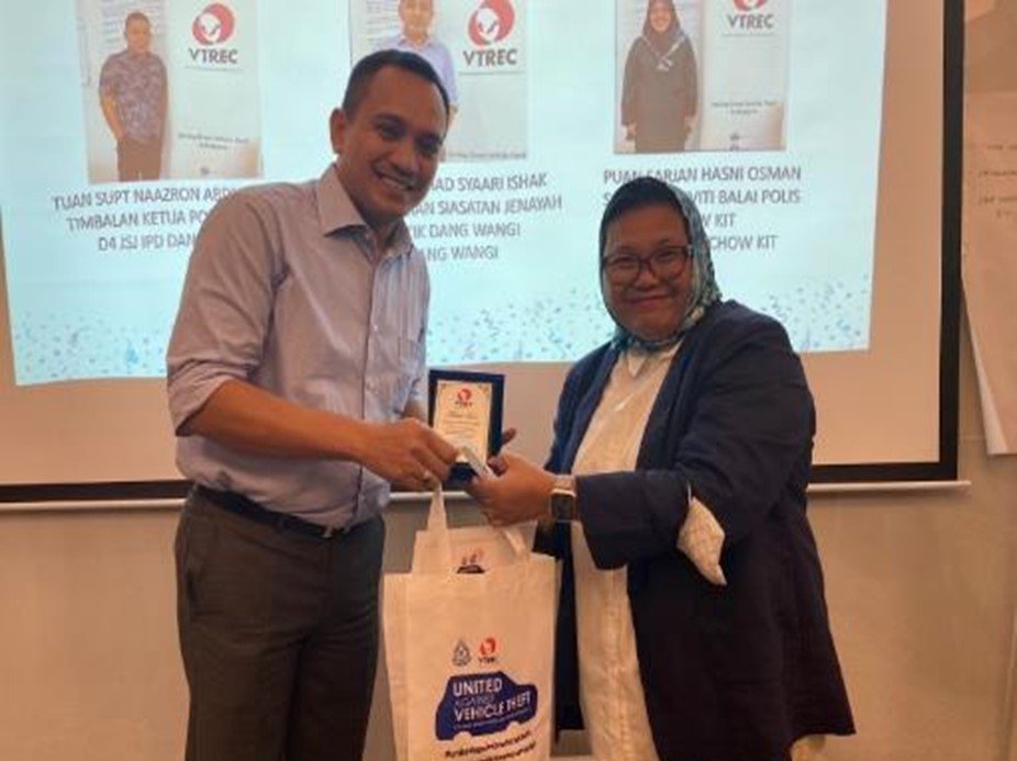 YBrs Puan Mas Tina Abdul Hamid, Co-ordinator of Vehicle Theft Reduction Council of Malaysia (VTREC) presenting a memento to YDH Tuan Supt Naazron Abdul Yusof, Timbalan Ketua Polis Daerah Dang Wangi, Polis Diraja Malaysia at the Lab IPD Dang Wangi – VTREC