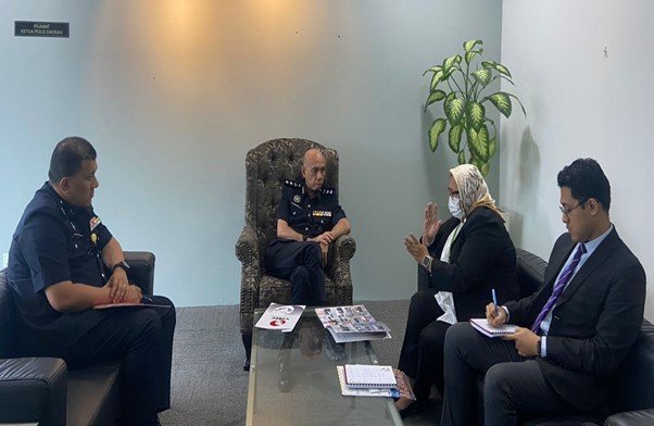 SENTUL, 25 September 2023: YBrs Puan Mas Tina Abdul Hamid, the Co-ordinator of the Vehicle Theft Reduction Council of Malaysia (VTREC), paid a courtesy call on YDH Tuan ACP Ahmad Sukarno Mohd Zahari, Sentul District Chief Police (OCPD). Also presented during the courtesy call were YDH Tuan DSP Davidson Tanggapan, Ketua Bahagian Pencegahan Jenayah dan Keselamatan Komuniti IPD Sentul, Puan Marlyana Mansur and Encik Aniq Denial Fauzi, the Executive Officers of VTREC.