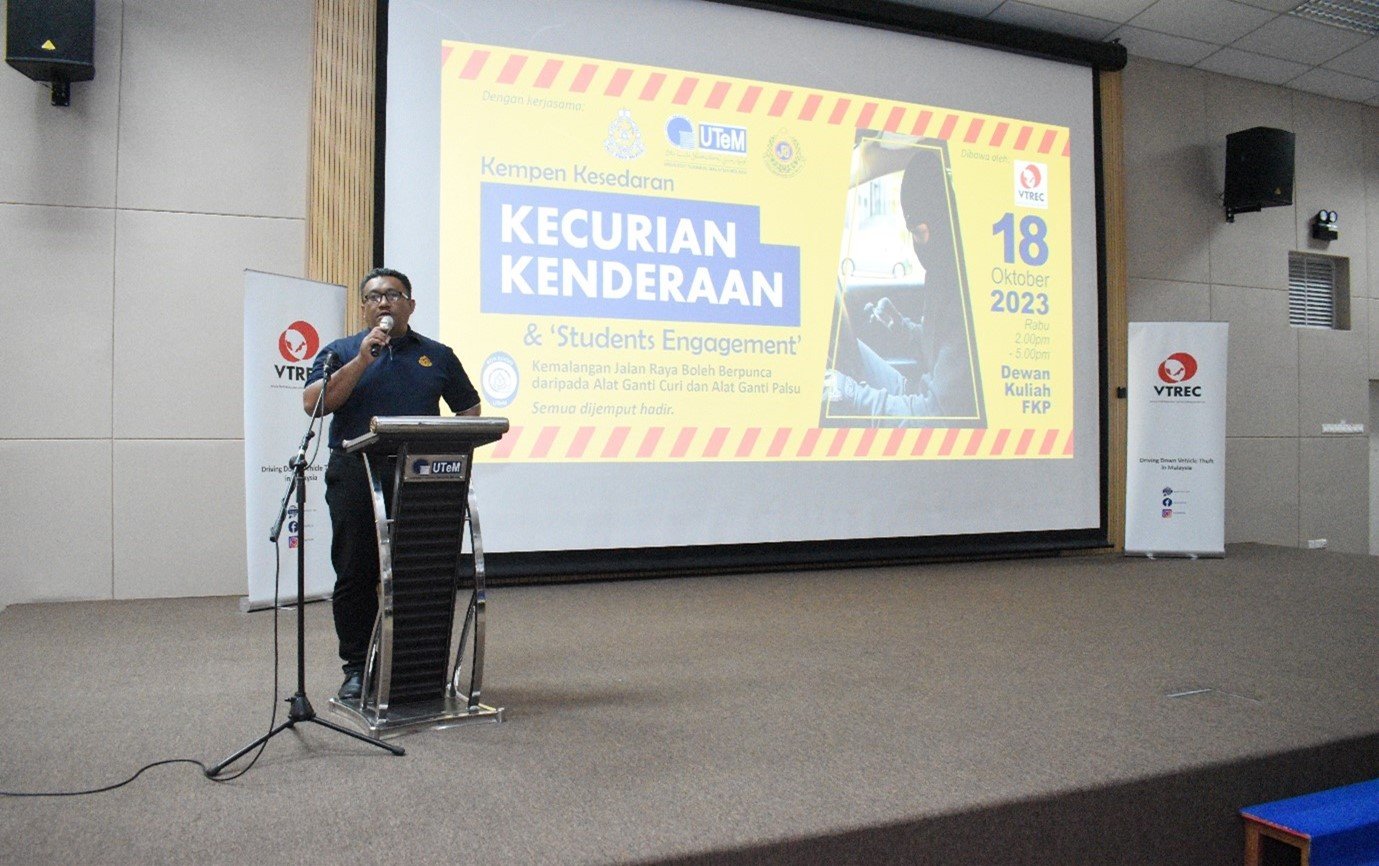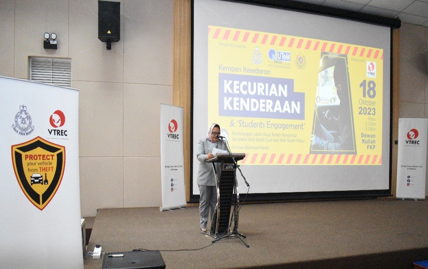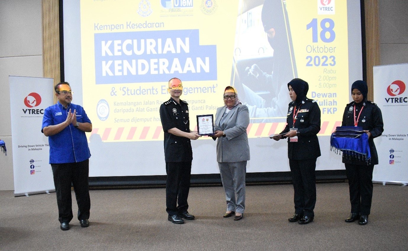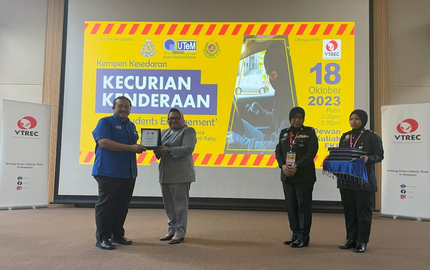 MELAKA, 18 Oktober 2023: The Vehicle Theft Reduction Council of Malaysia (VTREC) holds a strategic “Kempen Kesedaran Kecurian Kenderaan & Students Engagement” that causes road traffic accidents due to vehicles stolen parts as well as consequences of fake spare parts with the co-operation of Universiti Teknikal Malaysia Melaka (UTeM) and Kor Sukarelawan Polis Siswa Siswi (Kor SUKSIS UTeM). The event has taken place at Dewan Fakulti Pembuatan, UTeM, Ayer Keroh, Melaka.