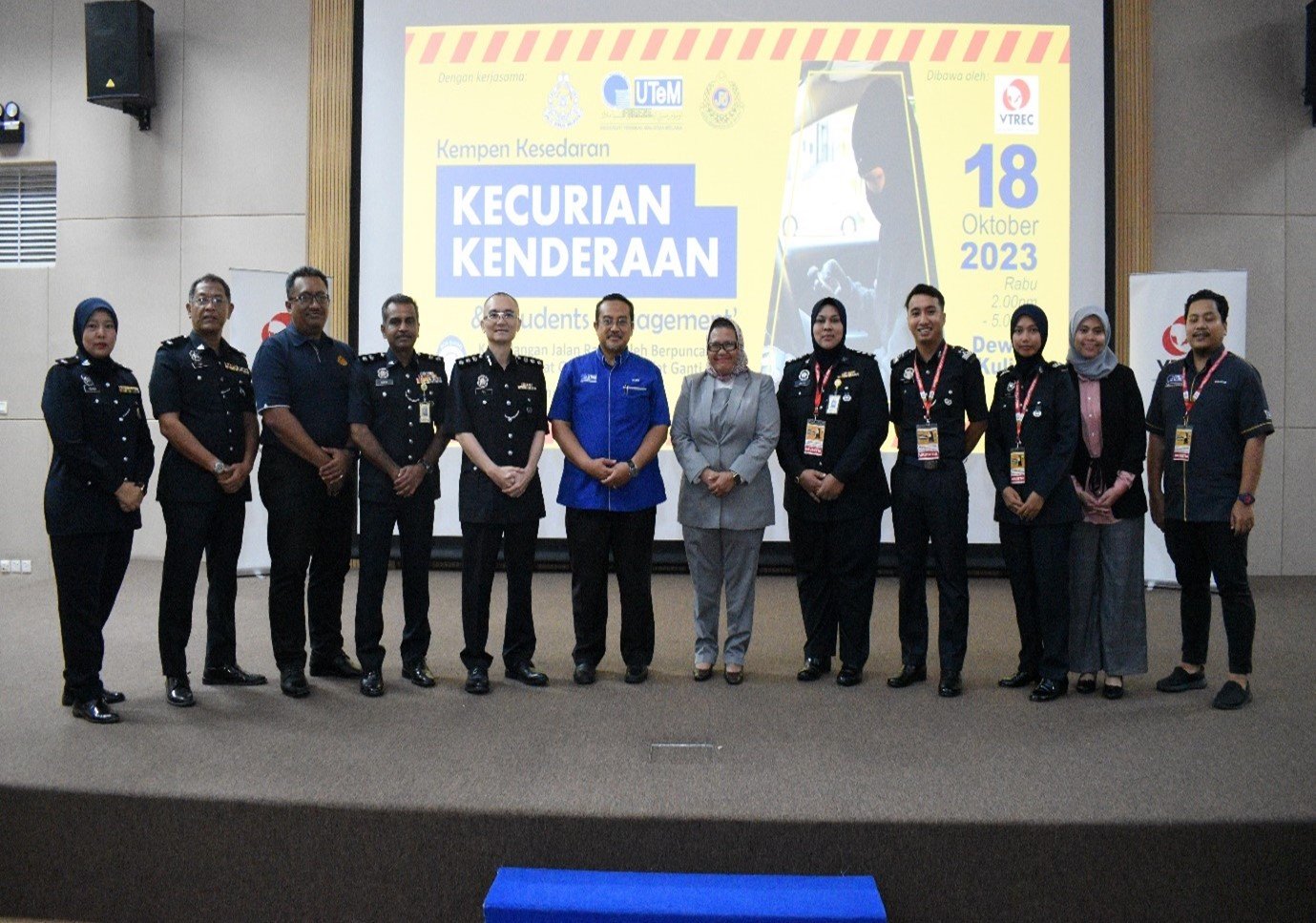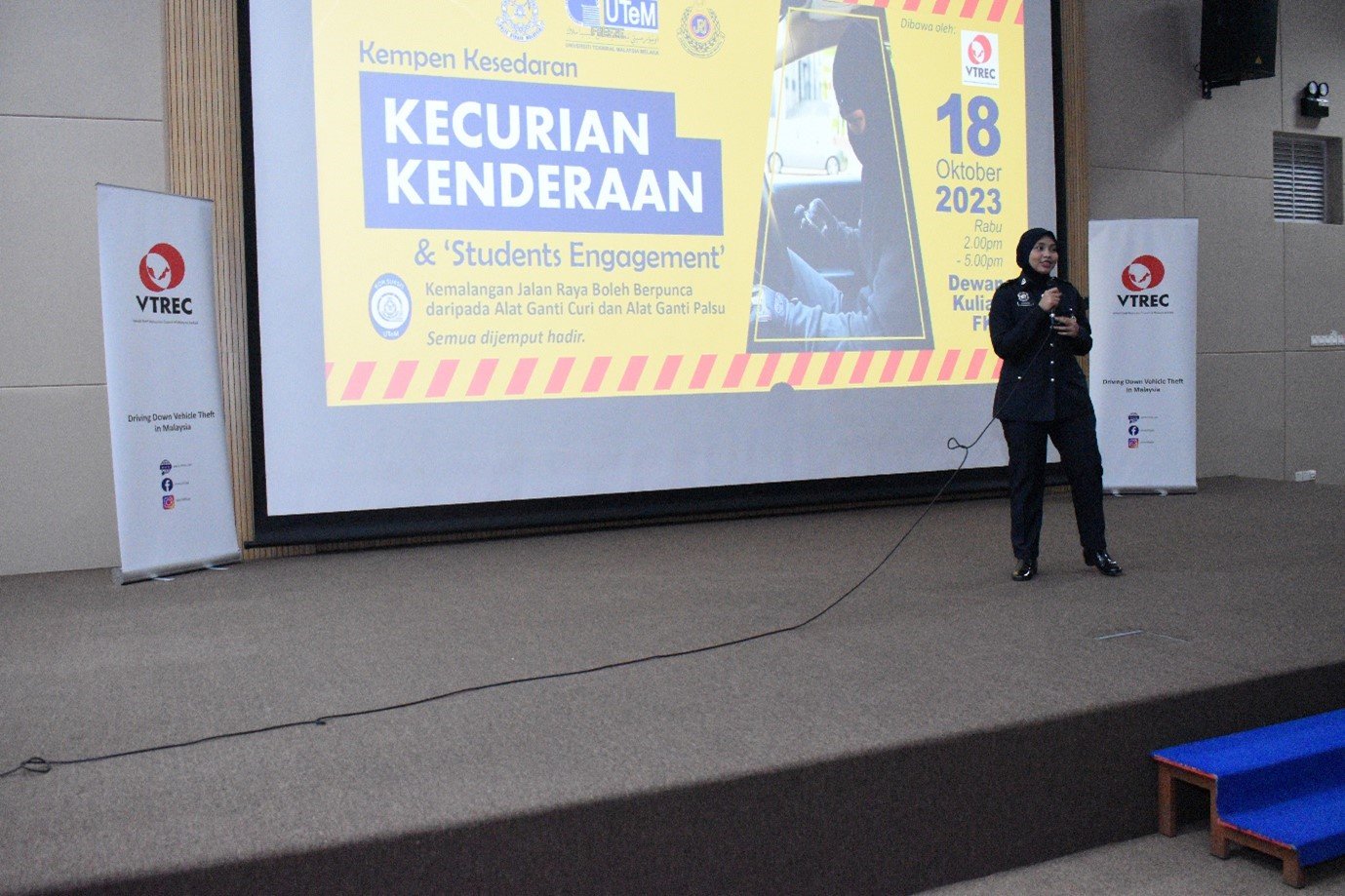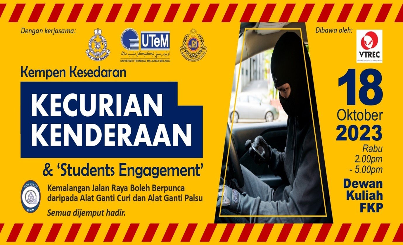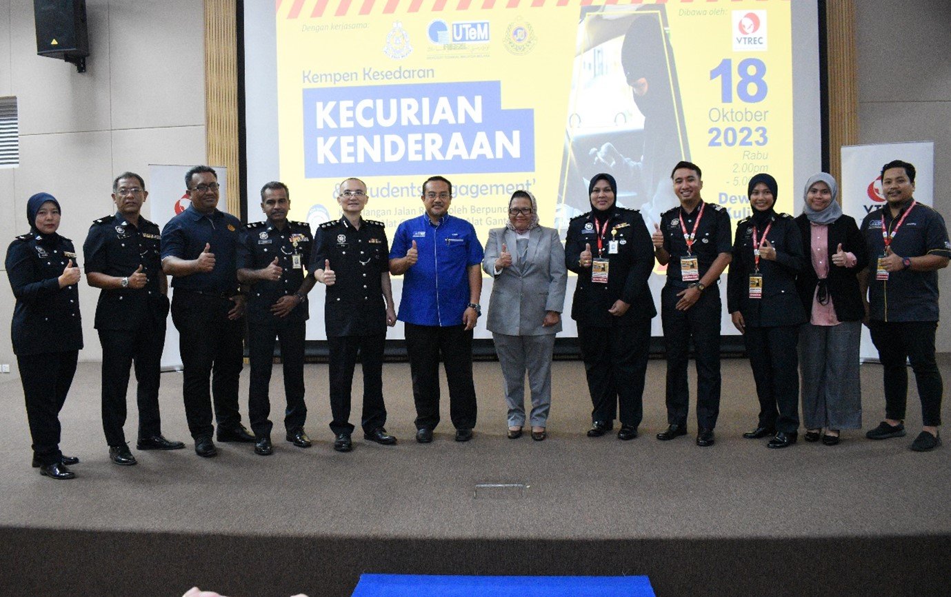 MELAKA, 18 Oktober 2023: The Vehicle Theft Reduction Council of Malaysia (VTREC) holds a strategic “Kempen Kesedaran Kecurian Kenderaan & Students Engagement” that causes road traffic accidents due to vehicles stolen parts as well as consequences of fake spare parts with the co-operation of Universiti Teknikal Malaysia Melaka (UTeM) and Kor Sukarelawan Polis Siswa Siswi (Kor SUKSIS UTeM). The event has taken place at Dewan Fakulti Pembuatan, UTeM, Ayer Keroh, Melaka.