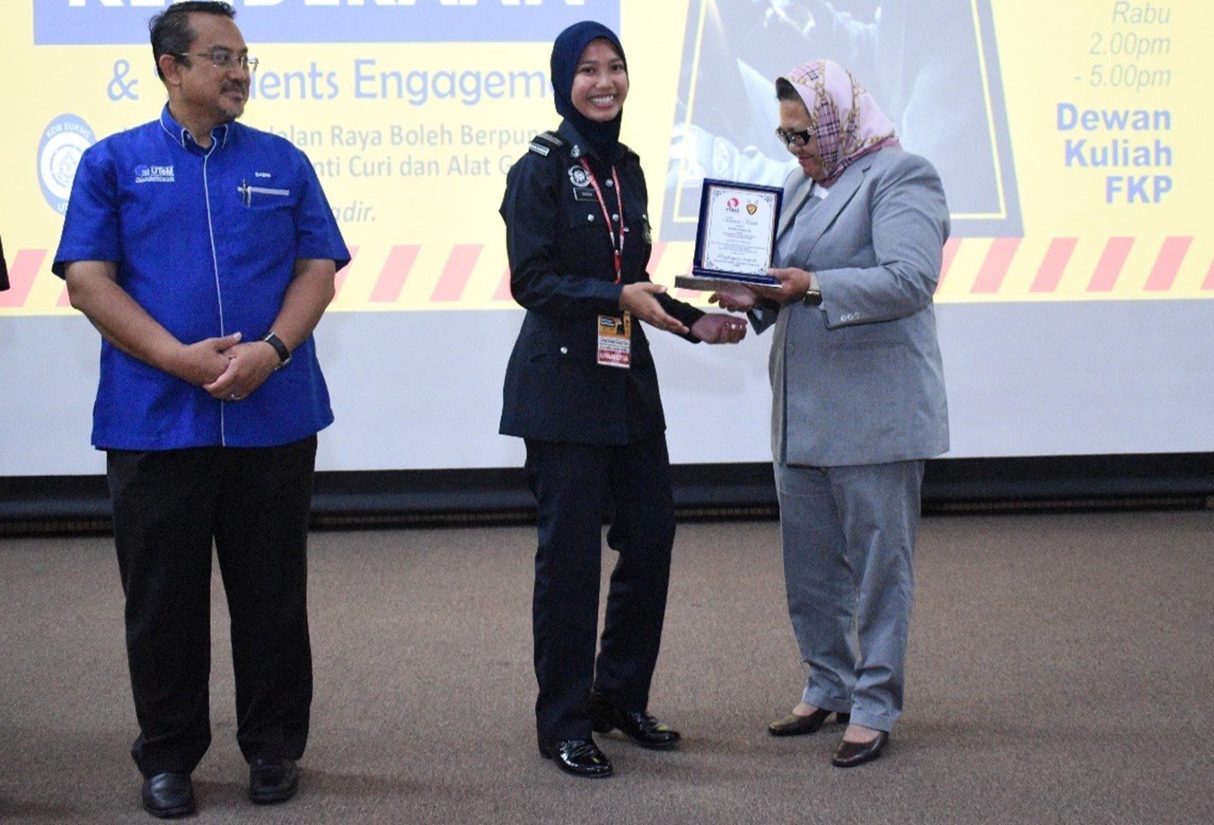 YBrs Puan Mas Tina Abdul Hamid, Co-ordinator of Vehicle Theft Reduction Council of Malaysia delivering momentos and appreciation to Saudara KS Muhammad Aidil Fadzly Saidina Omar, Presiden Kor SUKSIS UTeM