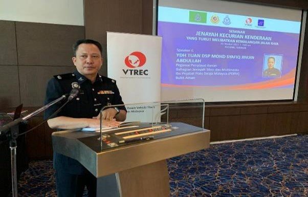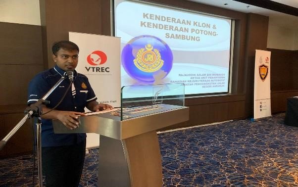 YBrs Encik Rajauddin Aslam Muniandy, Ketua Unit Pemantauan Bahagian Kejuruteraan Automotif, Jabatan Pengangkutan Jalan Negeri Sarawak as the fourth speaker delivering his sharing on “Kenderaan Klon dan Kenderaan Potong Sambung” at Vehicle Theft Reduction Council of Malaysia (VTREC) Seminar