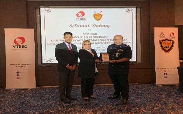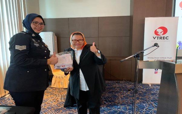 YBrs Puan Mas Tina Abdul Hamid, Co-ordinator of Vehicle Theft Reduction Council of Malaysia (VTREC) presenting a memento to YDH Tuan DSP Mohd Syafiq Jinuin Abdullah, Penyiasat Kanan, Bahagian Jenayah Siber dan Multimedia, Jabatan Siasatan Jenayah Komersil, Ibu Pejabat Polis Bukit Aman, Polis Diraja Malaysia at Vehicle Theft Reduction Council of Malaysia (VTREC) Seminar