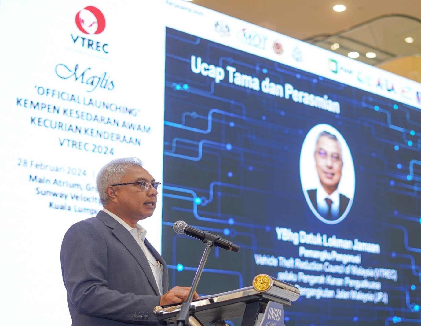 Kuala Lumpur, 28 February 2024: VTREC Nationwide Public Vehicle Theft Awareness Campaign 2024 (Kempen Kesedaran Awam Kecurian Kenderaan VTREC 2024) had officially launched by YBhg Datuk Lokman Jamaan, Pengarah Kanan Penguatkuasa, Jabatan Pengangkutan Jalan Malaysia (JPJ) at Sunway Velocity Mall, Cheras.