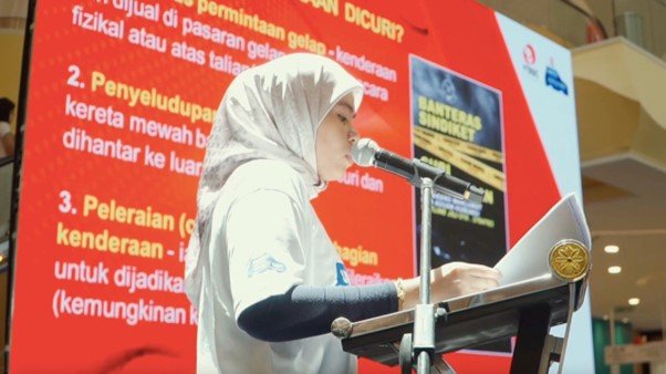 Encik Aniq Denial Fauzi, VTREC Executive Officer delivering his sharing during the Pocket Talk Session at the Official Launch ‘Kempen Kesedaran Awam Kecurian Kenderaan VTREC 2024’.