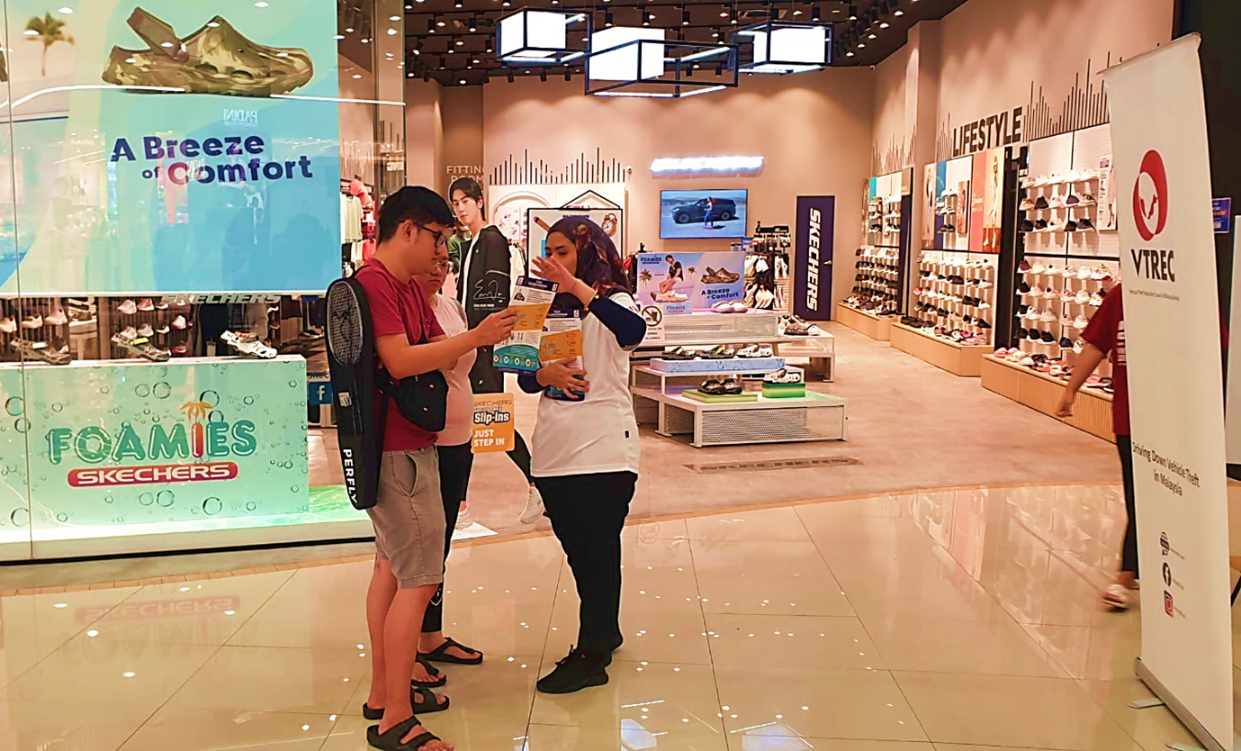 KPL Mohd Azrai Surimin and KPL Rofe writing a message on ‘Wall of Engagement’ during VTREC Mini Campaign at AEON Cheras Selatan