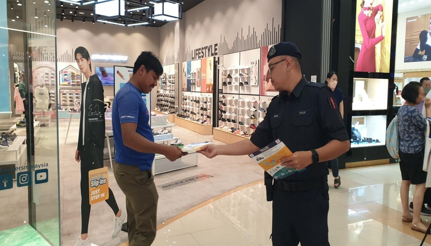 KPL Mohamad Azrai Surimin alongside KPL Nadiah Farhana Mohd Sani handed the reading material related to vehicle theft awareness to the public