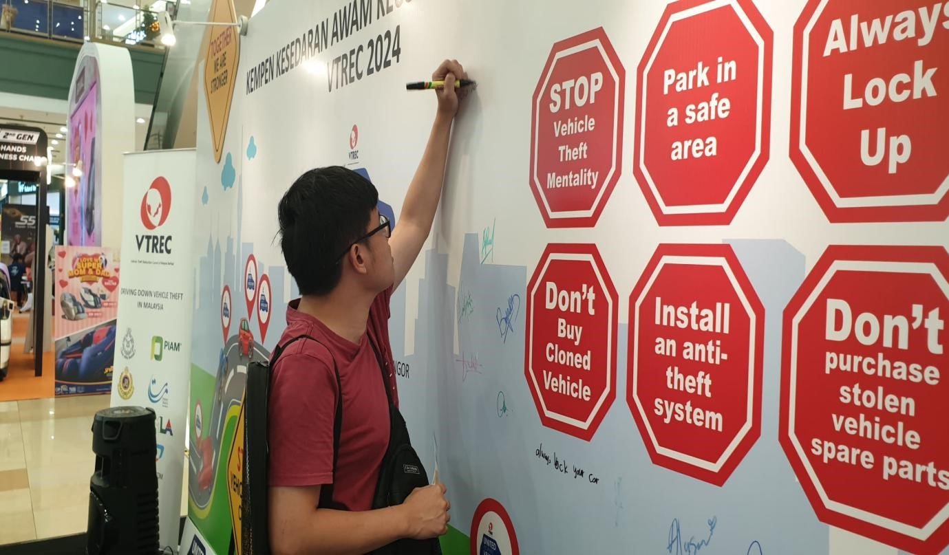 Visitors take the opportunity to leave a message on the engagement wall at the Mini Campaign of ‘Kempen Kesedaran Awam Kecurian Kenderaan VTREC 2024’