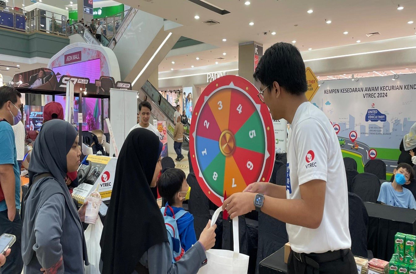Visitors trying out the ‘Wheel of Fortune’ and steering lock games to take home mystery gifts prepared by VTREC during the Mini Campaign of ‘Kempen Kesedaran Awam Kecurian Kenderaan VTREC 2024’
