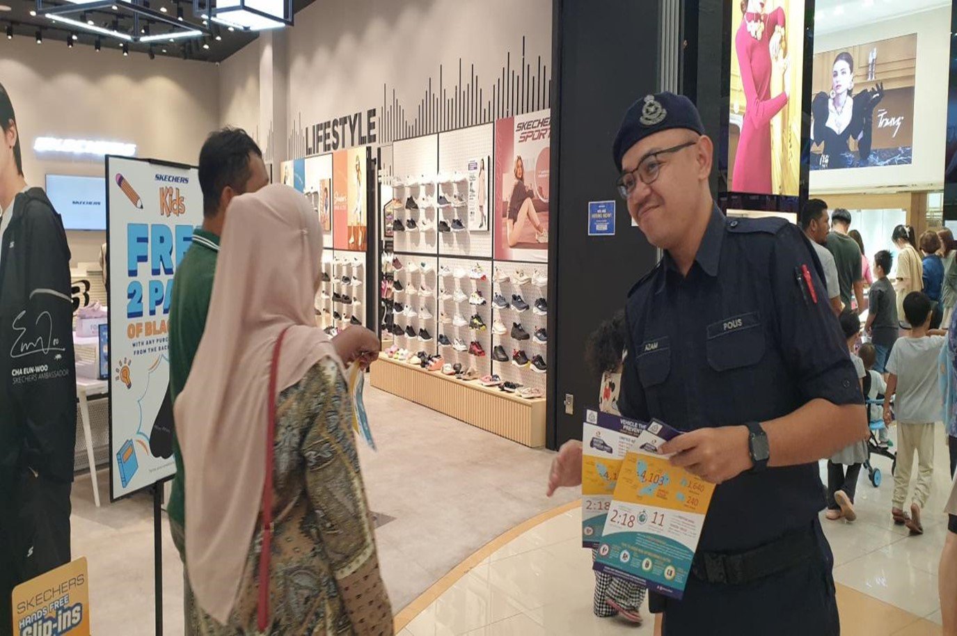 KPL Azam distributing flyers to the public during the Mini Campaign of ‘Kempen Kesedaran Awam Kecurian Kenderaan VTREC 2024’