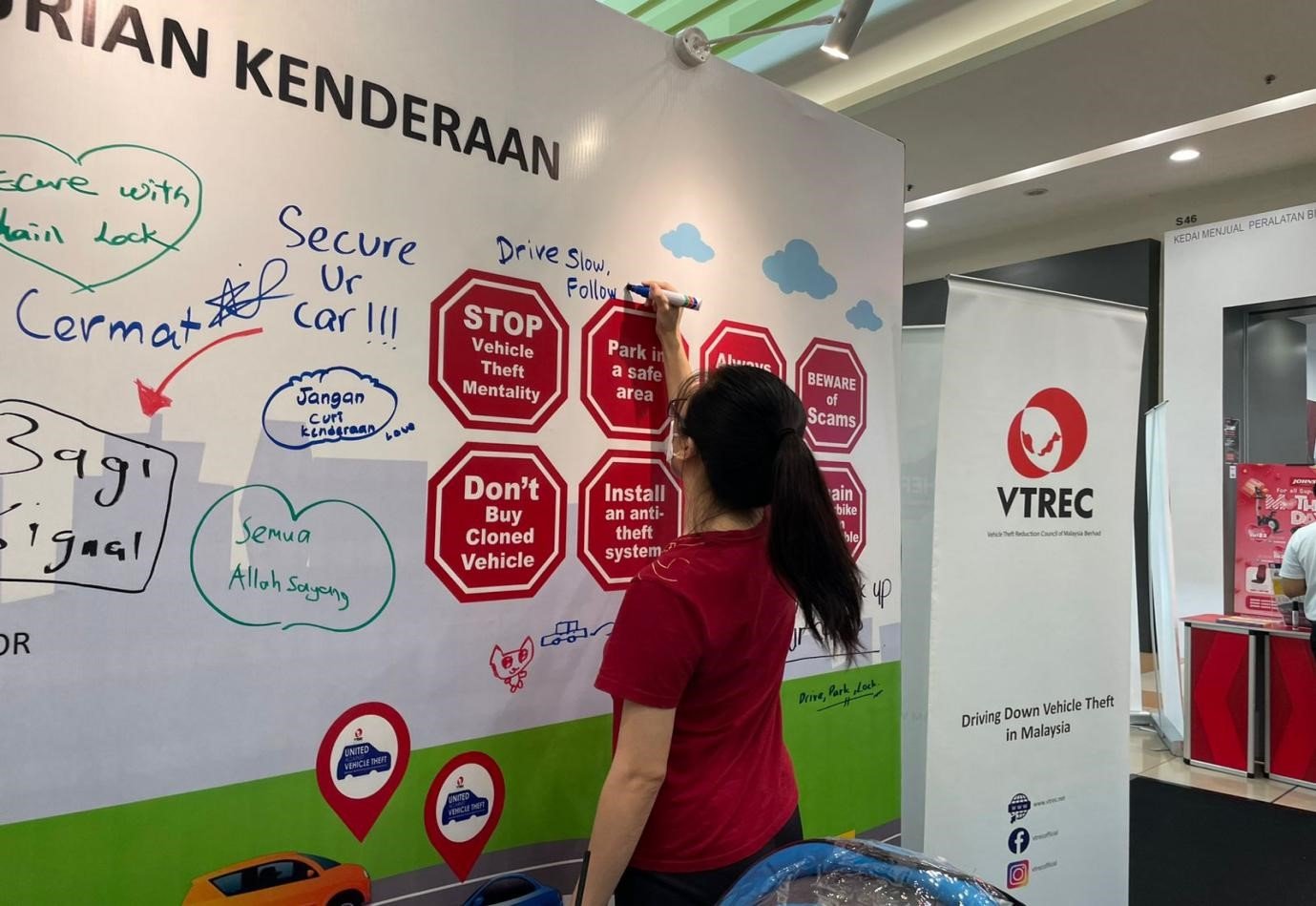 Numerous activities were orchestrated to motivate the public to engage, support and pledge their participation in this mini-campaign. The public can leave the message to another as a reminder to not be a victim of vehicle theft on the ‘Wall of Engagement’. Other activities arranged by VTREC to attract the public to engage in this mini-campaign are ‘Wheel of Fortune’ and ‘Steering Lock Educational Games’ that challenged the public to properly apply a steering lock under three seconds.