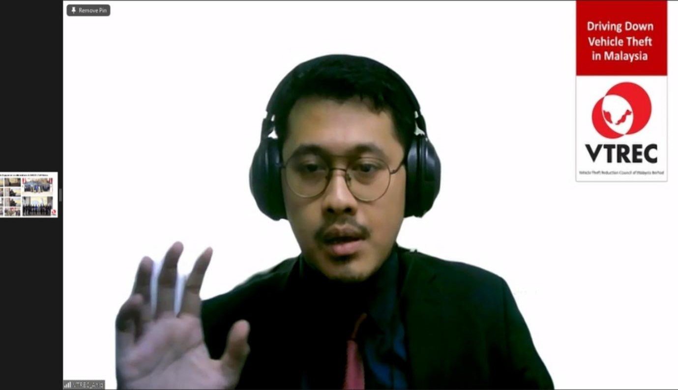 Encik Aniq Denial Fauzi, Executive of Vehicle Theft Reduction Council of Malaysia presenting the previous Student Engagements that have been organised by VTREC at Universiti Teknikal Malaysia Melaka (UTeM), Melaka and Universiti Malaya, Kuala Lumpur