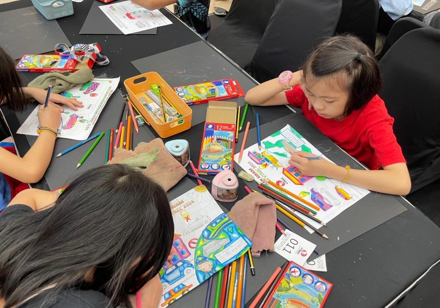 Parents actively encourage their kids to finish the colouring during the colouring competition