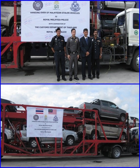 More than 70 stolen cars were repatriated from Thailand since January to August this year. They were among smuggled vehicle seized by Thai Customs and Royal Thai Police. The cars from various models were stolen in Malaysia and smuggled into Thailand. Among others, on January 2015 Thai Royal Police Chief, Mr Somyot Poompanmoug returns luxury cars to Inspector-General of Royal Malaysia Police, Tan Sri Dato Sri Khalid bin Abu Bakar at the Royal Thai Police in Bangkok, Thailand. All of the cars have been returned to the rightful owners in Malaysia.