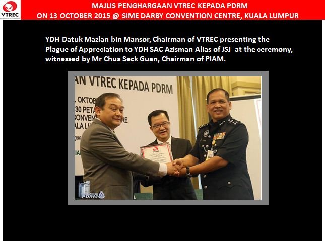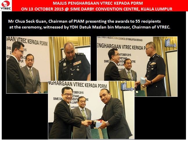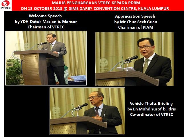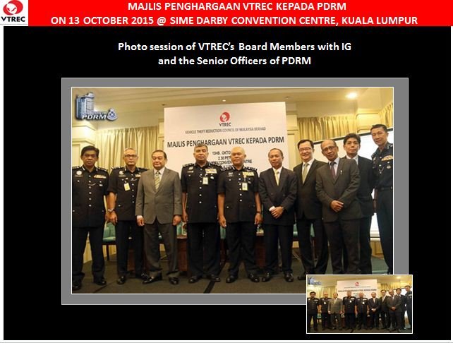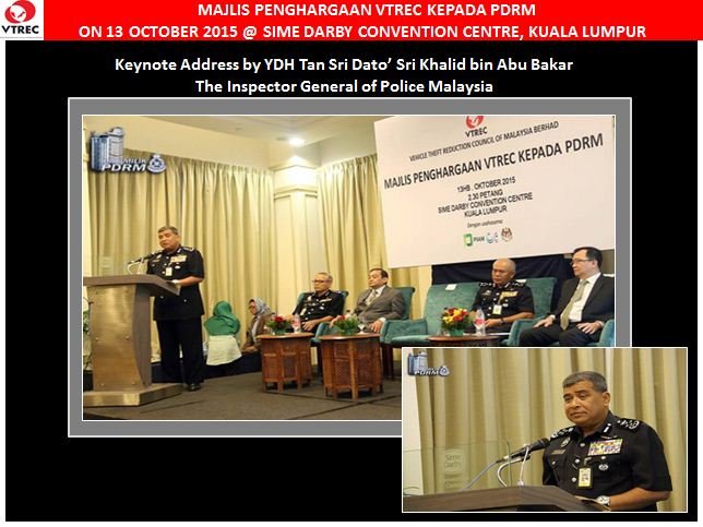 Vehicle Theft Reduction Council of Malaysia (VTREC) recently hosted an appreciation event for PDRM at Sime Darby Convention Centre, Kuala Lumpur on 13th October 2015. The Inspector General of Police, YDH Tan Sri Datuk Sri Khalid bin Abu Bakar was the guest of honour.