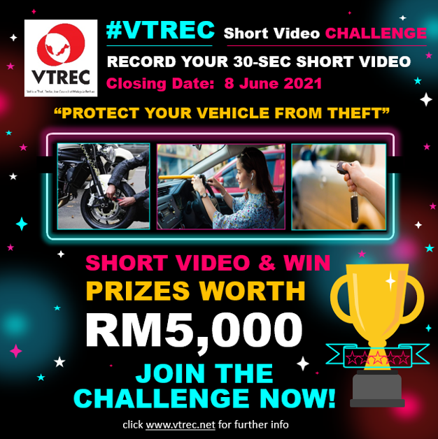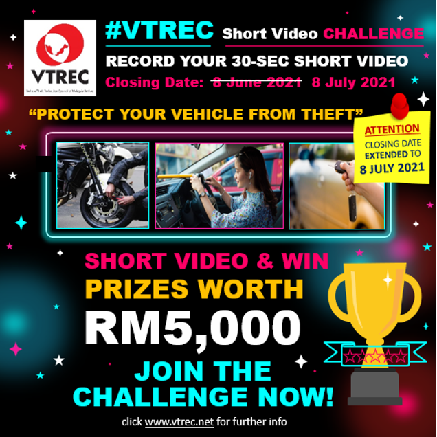 VTREC Short Video Challenge (“#VTRECShortVideo”) is a contest organized by Vehicle Theft Reduction Council of Malaysia Berhad (771609-T), hereby known as the “Organizer” or “VTREC”. The Organizer may, at its sole and absolute discretion extend or shorten the Contest Period at any time without any prior notice to any party (the “Extended or Shorten Period“).